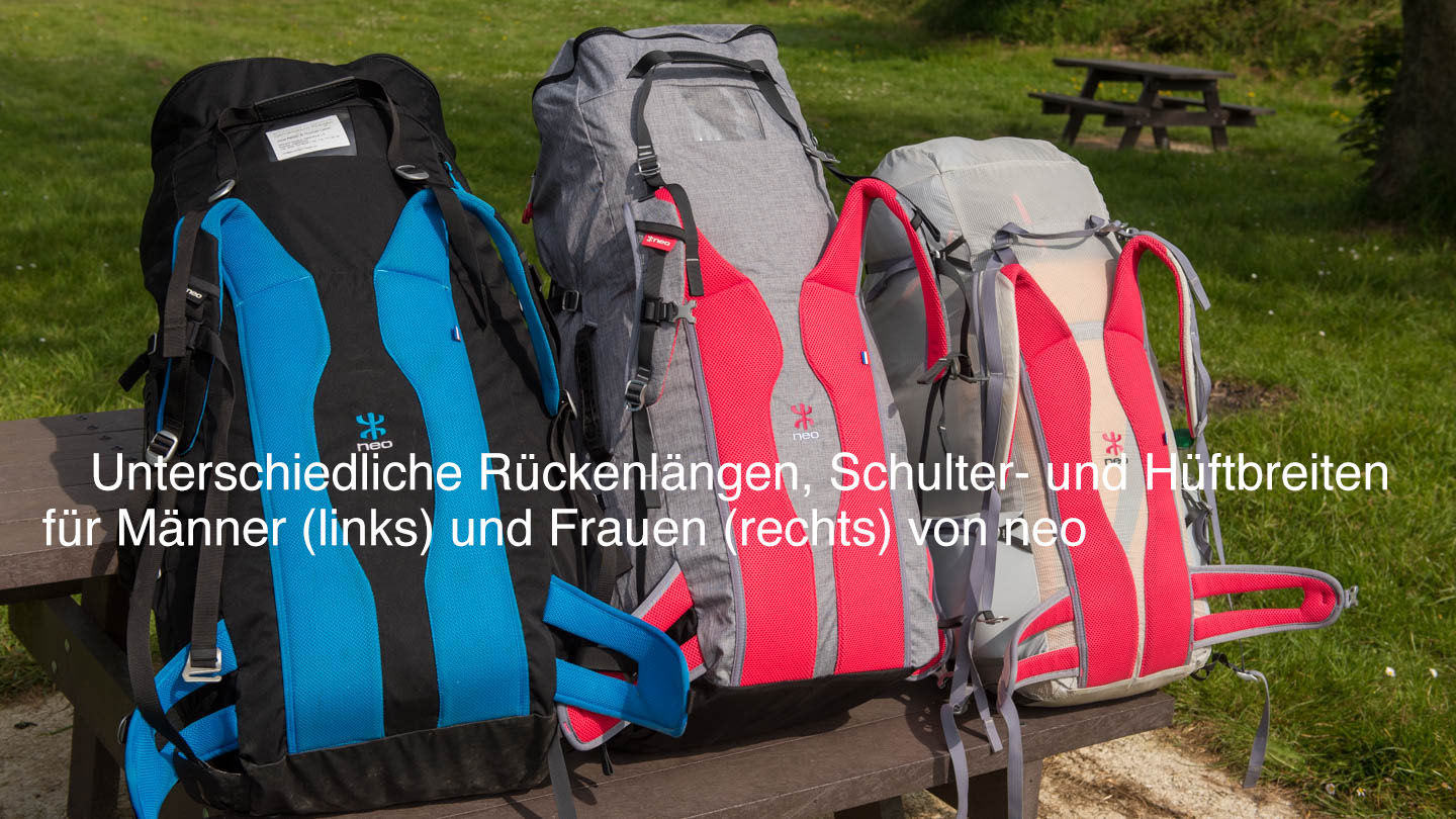 Auch Rückenlänge, Schulter- und. Hüftbreite spielt eine wichtige Rolle für einen guten Tragekomfort. Hier wird es jetzt noch einmal kompliziert: die meisten Rucksäcke sind für Männer konzipiert, d.h. sie haben einen breiten Abstand der Schultergurte und sind in der Hüfte eher schmal angepasst, das ganze bei einem Rücken, der im Verhältnis zur Körpergröße eher lang ist.